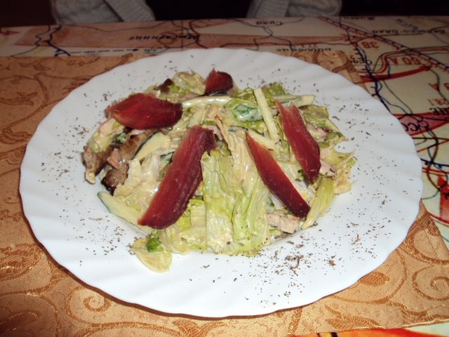 Салат «Штабной», состав: телятина, балык, свежий огурец, бастурма, салат «Айсберг», майонез, соевый соус.
