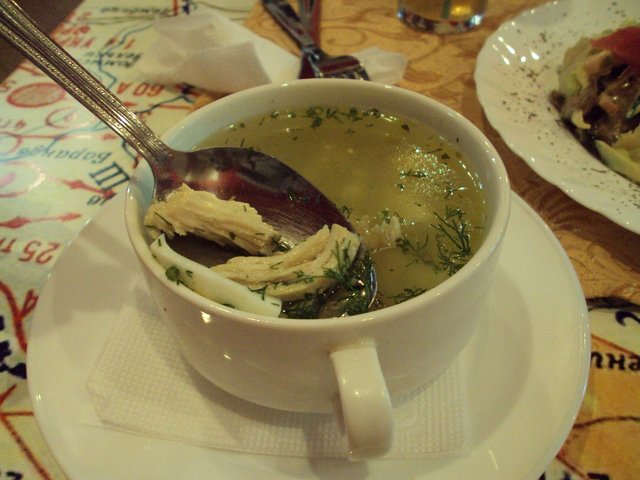 По совету официанта еще заказали Такос «Аль-поло» (блюдо мексиканской кухни, которое готовится из кукурузных лепешек, в которые кладут начинку) – 26 гривен, 170 грамм. И куриный бульон «Марш-бросок» – 15 гривен, 300 грамм.