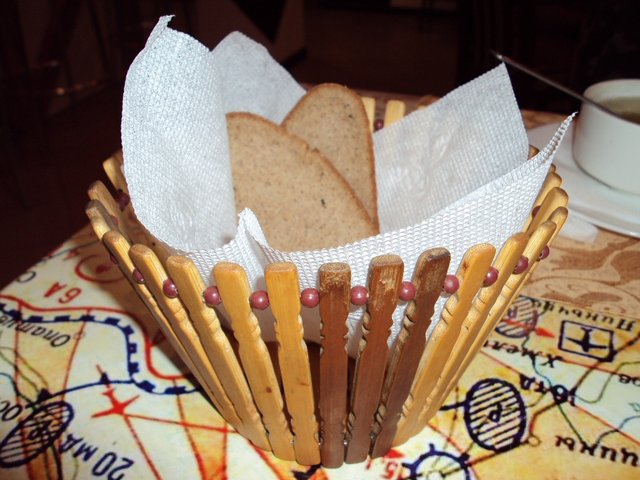 Хлеб принесли в симпатичной корзинке на салфетках. Хлеб обычный, черный круглый.