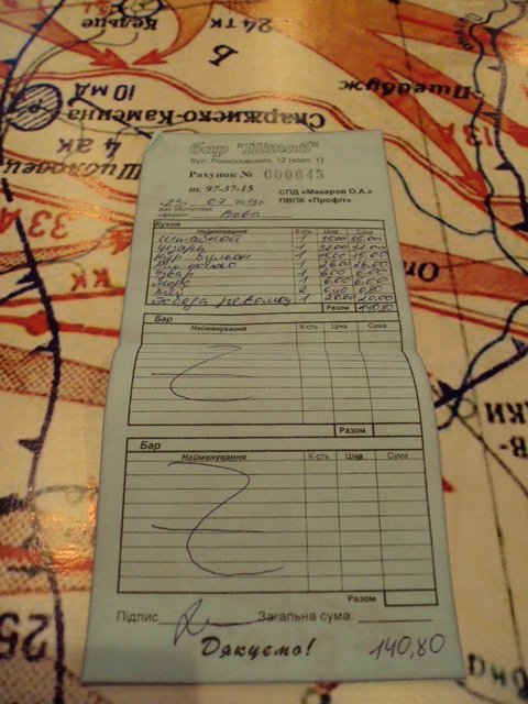В итоге счет за 9 поизиций, включая хлеб составил 140 гривен 80 копеек. Сам счет принесли в кожаном чехле с фирменной маркировкой водки Stoletov.