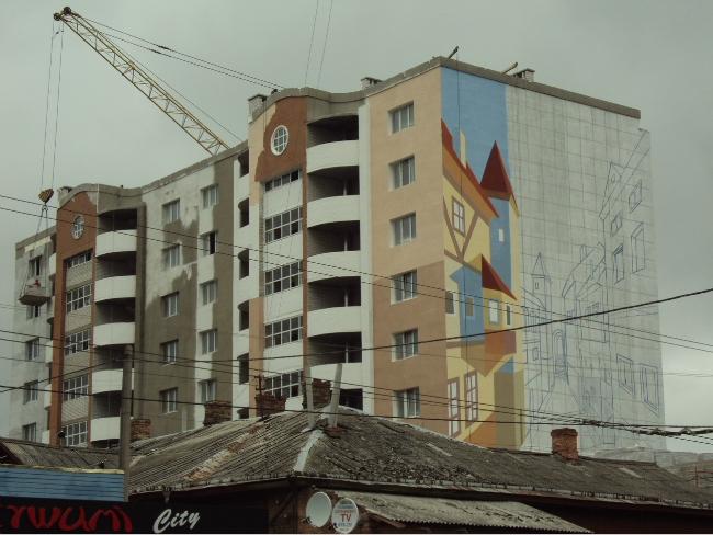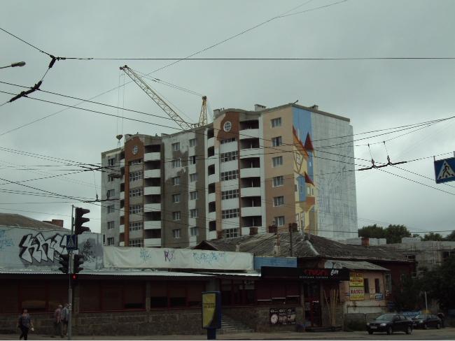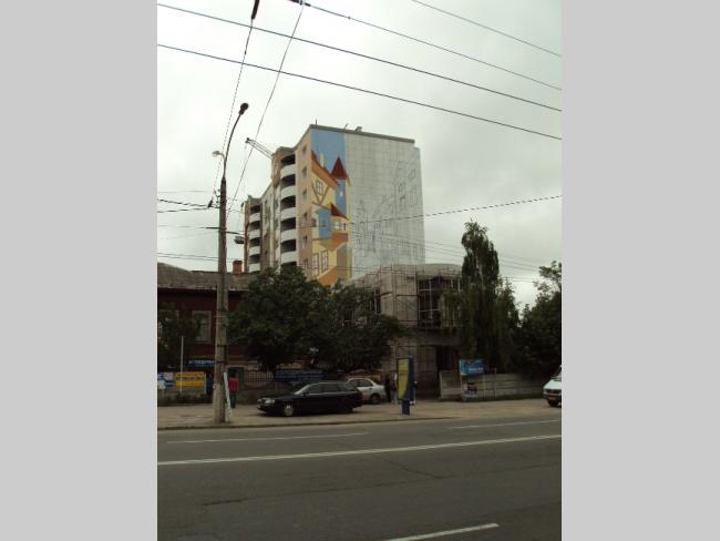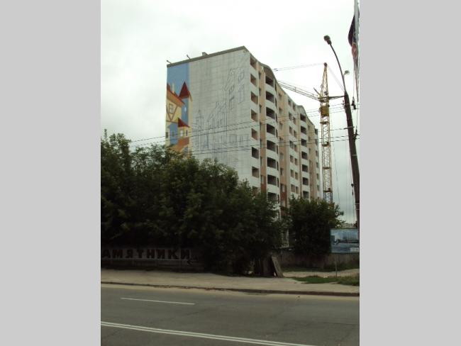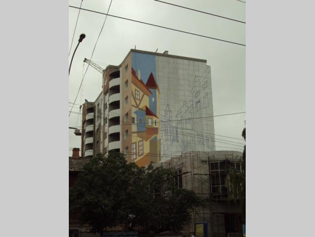 По проспекту Победы новостройку на берегу Стрижня начали разрисовывать художники. Оригинальный рисунок в виде домов, расположившихся по бокам улицы, значительно украсит боковую часть нового жилого дома. К тому же это, пожалуй, первый масштабный рисунок на здании в Чернигове.