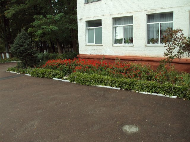 Ревизия началась со школьного двора, который произвел на меня благоприятное впечатление, так как был тщательно убран. Приятно было увидеть и симпатичные клумбы с цветами, буквально в нескольких метрах от парадного входа.