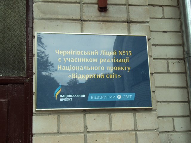 Справа от центрального входа в лицей на стене закреплена табличка с надписью: Чернігівський Ліцей №15 є учасником реалізації Національного проекту «Відкритий світ». Выгоду от данного проекта вы увидите, когда я буду рассказывать о кабинете информатики и техническом оснащении лицея. А пока скажу несколько слов о холле и гардеробе учебного заведения.