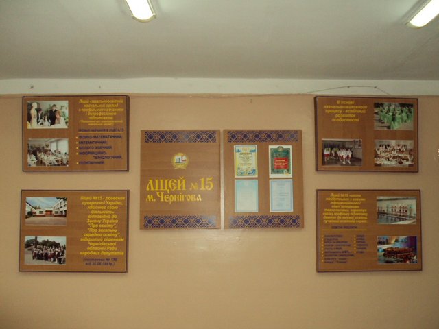 Черниговский лицей №15 в прошлом году отпраздновал свое 50-летие. Из маленькой 8-летней школы была создана средняя образовательная школа, а затем, в 1991 году школа была переименована в лицей. На сегодняшний день в учебном заведении преподает 101 учитель, а также 16 представителей высших учебных заведений, которые читают спецкурсы и факультативы. В школе сформировано 44 класса, в которых обучается 1340 учеников. В 8-9 классах дети начинают углубленно изучать математику, физику, химию, биологию и информатику. 10-11-е классы – лицейные классы физико-математического, химико-биологического, экономического и информационно-технологического профилей. Лицей работает в одну смену, здесь созданы все условия для проведения эффективного учебно-воспитательного процесса.