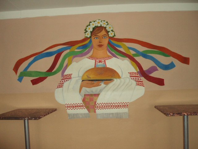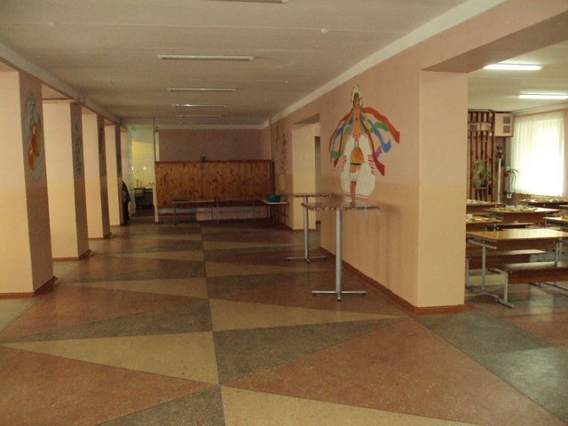 Помещение столовой достаточно просторное, одновременно покушать в нем могут больше 200 человек. В центре столовой находится свободное пространство, а слева и справа расположены секторы с обеденными столами.