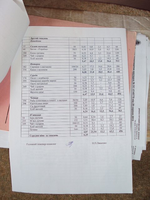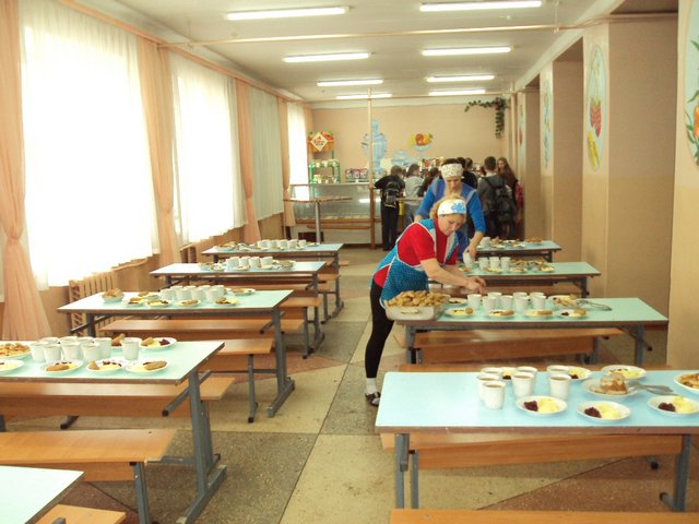 Столовая работает по двухнедельному меню, которое утверждено санитарно-эпидемиологической станцией и управлением образования. Начальная школа питается на 6,25 гривен. 2,25 грн. платят родители, остальное доплачивает городской бюджет. Льготные категории детей питаются на 6 гривен. Всего льготников 82 человека. Старшая школа также питается на 6 гривен. Группа продленного дня в обед питается на 7 гривен. То есть в день с завтраком и обедом школьник может покушать на 13,25 грн. В группе продленного дня 17 человек питается бесплатно и 100 человек питается за родительский счет.