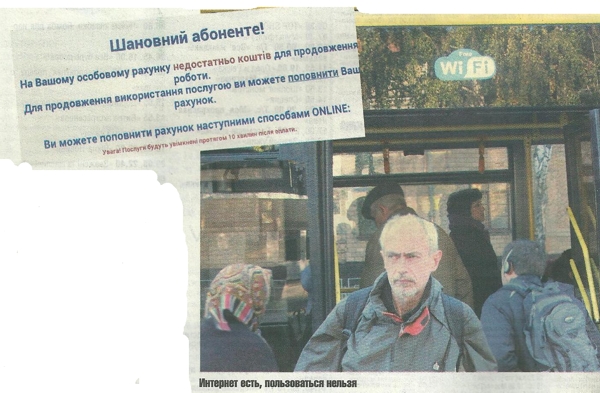 В августе этого года городские власти пообещали бесплатный беспроводный Интернет в троллейбусе №1. Прошло два месяца. Решили поискать Интернет. Зашли в троллейбус на конечной остановке «единицы», возле ж/д вокзала. Включили планшет. Пытаемся зайти в Интернет. Wi-Fi в троллейбусе есть. Но зайти в сеть нельзя. На экране появилась табличка: «Щоб зайти в Інтернет, необхідно поповнити рахунок».