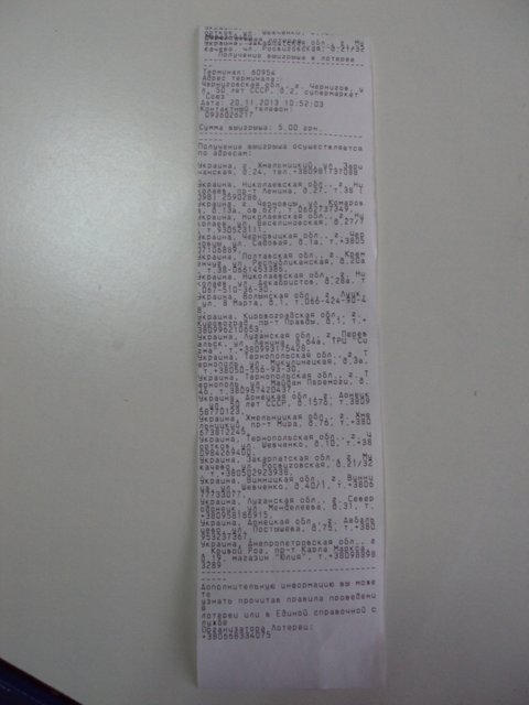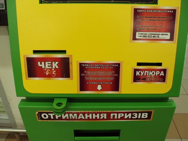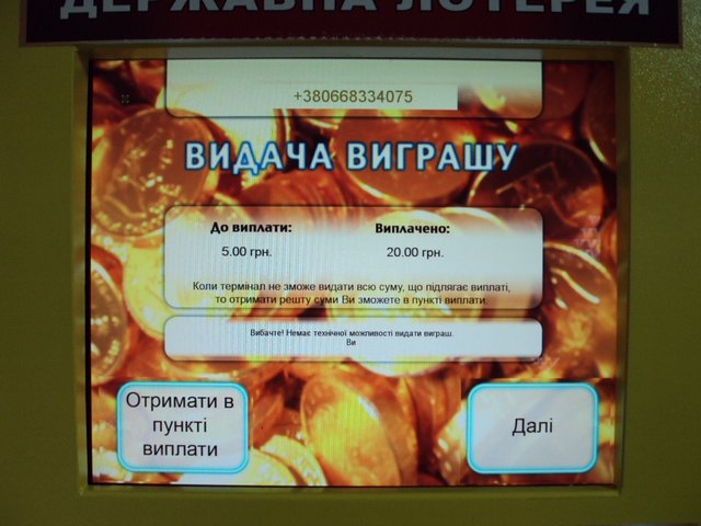 Для того чтобы получить свои деньги нужно было ввести свой номер мобильного телефона. Далее на экране появилась надпись с выплатой. В карман для выдачи выигрыша выпала купюра номиналом в 20 гривен.