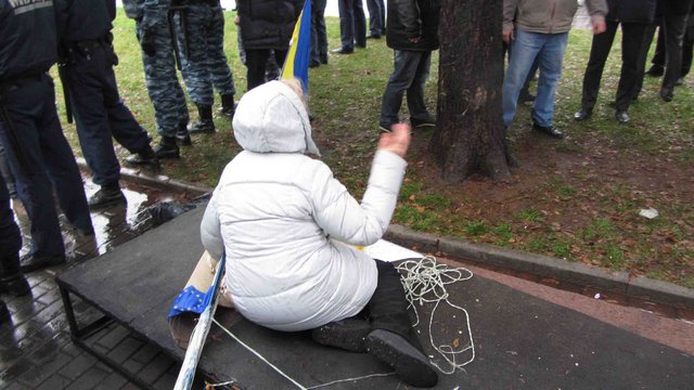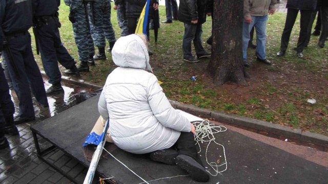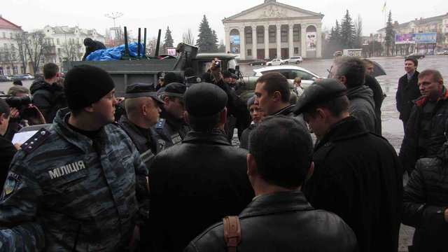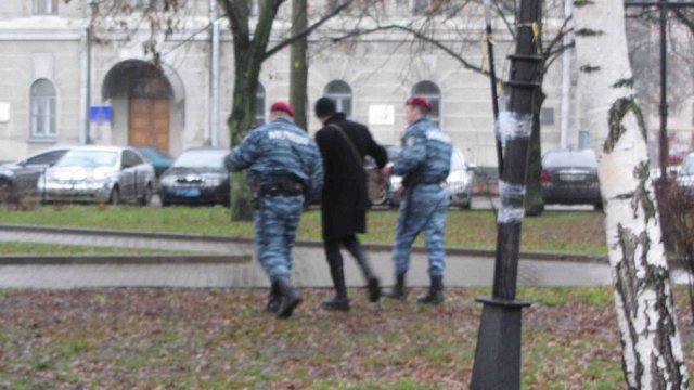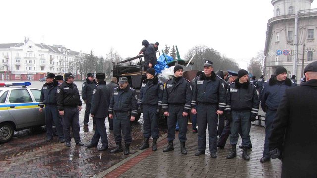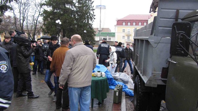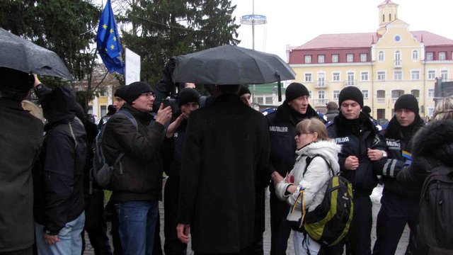 По словам сотрудников милиции один из участников митинга попытался облить себя бензином. Журналисты «Города» подошли к месту событий в тот момент, когда два правоохранителя уже уводили парня с места событий в направлении милицейского автобуса, стоявшего в районе улицы Шевченко.
