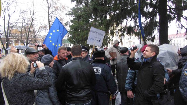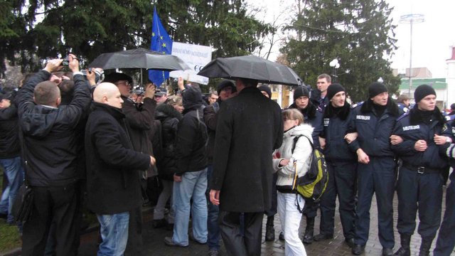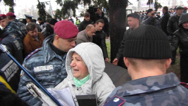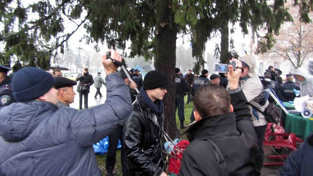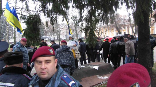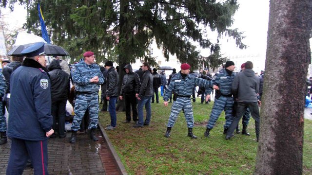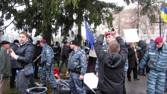 Активных защитников «европлощадки» было человека три-четыре. Они находились внутри плотного кольца правоохранителей. Те, кто прибывал на Красную площадь, попасть за периметр не могли. Тем не менее, прибывшие на поддержку, звонили и звали на помощь своих друзей и знакомых. Количество защитников «евромайдана» возрастало. Оценив ситуацию, милицейские руководители решили перестраховаться – к месту конфликта подтянулось еще около двух десятков милиционеров.