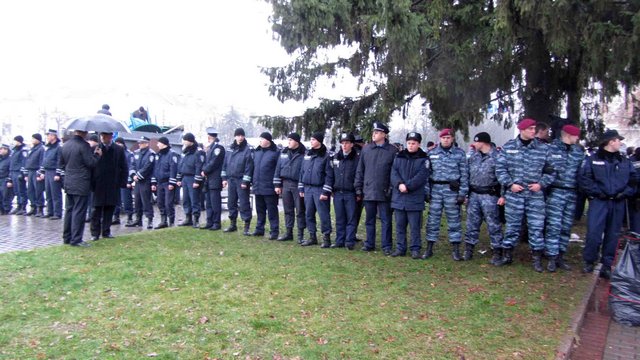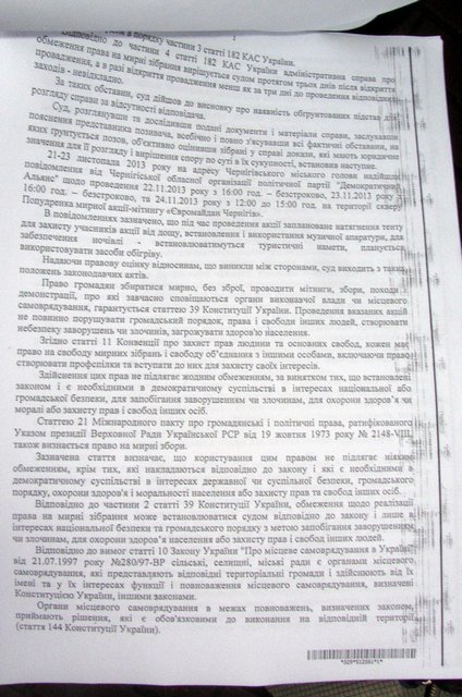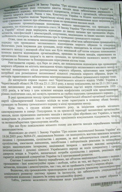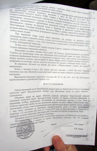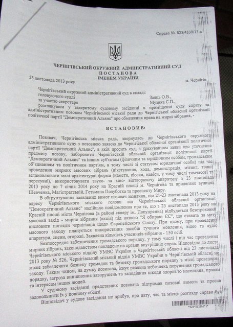 Около 12 часов дня на Красной площади в Чернигове началась операция исполнительной службы по выполнению решения Черниговского окружного административного суда, который 23 ноября принял решение запретившее политической партии «Демократический альянс» и другим субъектам во время проведения мирных собраний проводить установку малых архитектурных форм, использовать звуко- и киновоспроизводящую аппаратуру с 23 ноября 2013 года по 7 января 2014 года.