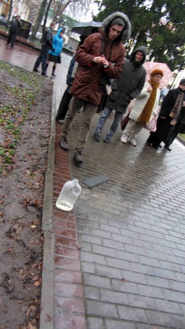 На месте событий стоял резкий запах бензина. В шестилитровой «балсанке», которая стояла без какого-либо присмотра, осталось грамм 300 бензина. Вся брусчатка при входе в парк была в бензине, и его радужные потоки вместе с дождевой водой стекали в ливневку.