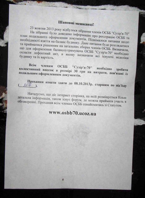 «23 жовтня 2013 року відбулося зібрання членів ОСББ "Сузір'я-70". На зібранні було доведено інформацію про реєстрацію ОСББ та план подальшого оформлення документів (виготовлення печатки, реєстрація в податковій службі, в пенсійному фонді, ін.). Піднімалося питання щодо необхідності взяття на баланс будинку. Дане питання буде розглядатися та прийматися рішення на загальних зборах членів ОСББ. Визначили, що для оформлення балансоутримувача ОСББ "Сузір'я-70" необхідно скласти дефектний акт, в якому визначити всі існуючі недоліки будинку та їх вартість…»