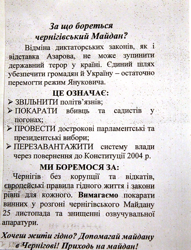 Как и все украинские майданы, черниговский также поддерживает участников главного столичного Майдана в их требованиях. Они хорошо известны, и активисты черниговского Майдана раздают листовки с этими требованиями призывая митингующих убеждать своих знакомых и друзей в правоте этих требований и приводить их на Майдан.