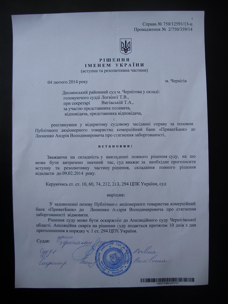 Банк, коли почув про це, згодний був уже хоча б на 5 тисяч грн. Але чому мені платити їм 5 000? Сьогодні, 4 лютого 2014 року, відбувся суд, який відмовив банку у всіх його претензіях, виходячи із закінчення строку позовної давності.