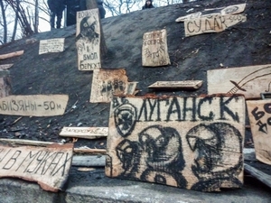Из того что запомнилось. Наверное, это своеобразный уличный музей, который сделали между улицей Грушевского и Мариинским парком сами силовики. Там стоят досточки-таблички, на которых беркутовцы выжигают названия своих населенных пунктов. Его много фотографируют журналисты.