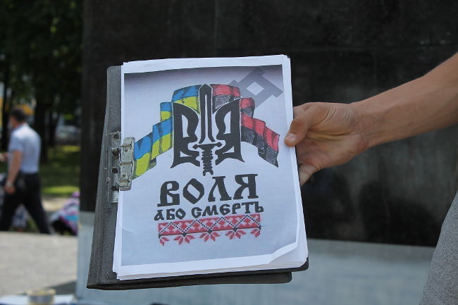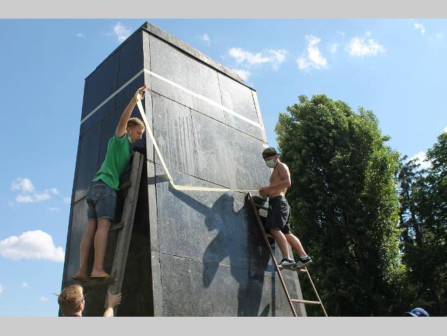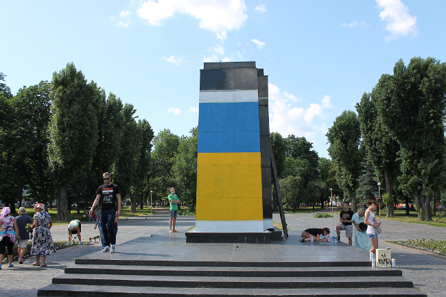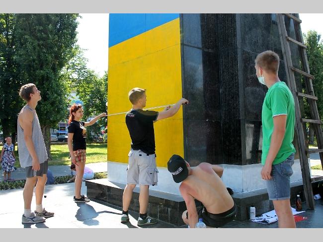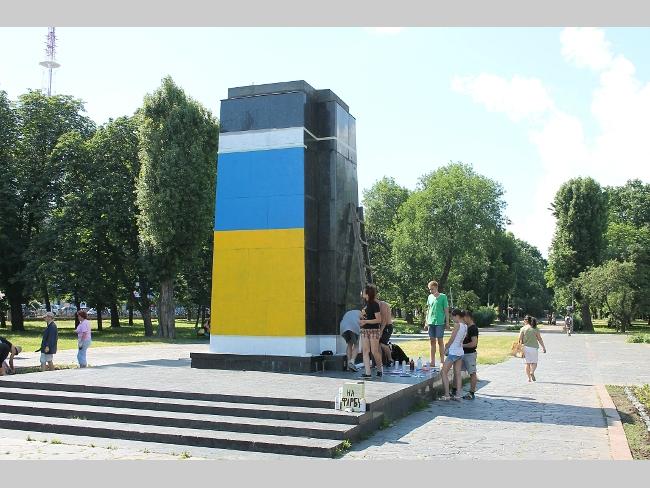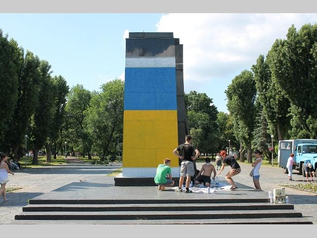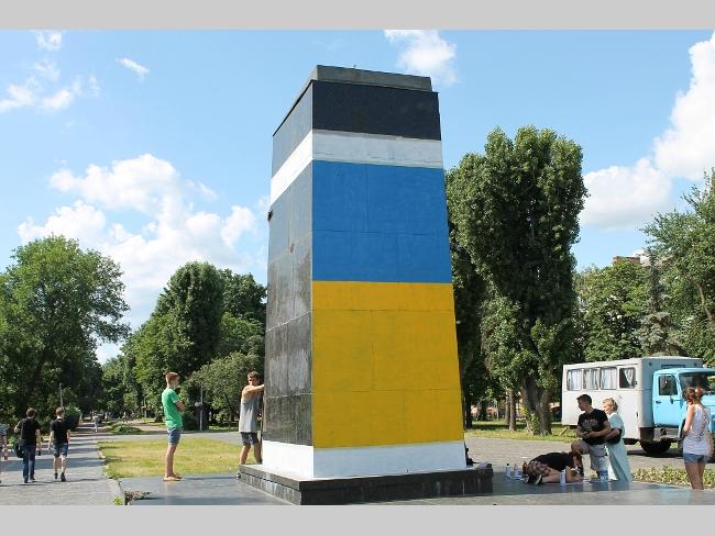 Оказалось, что это активисты «Правого сектора», решили разрисовать постамент национальной символикой. Инициатива принадлежит их лидерам — Владиславу Литвину и Максиму Коношевичу. По словам активистов, такая работа согласована с руководством ЖЕК и милицией.