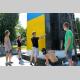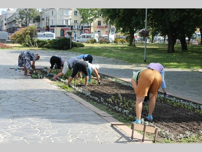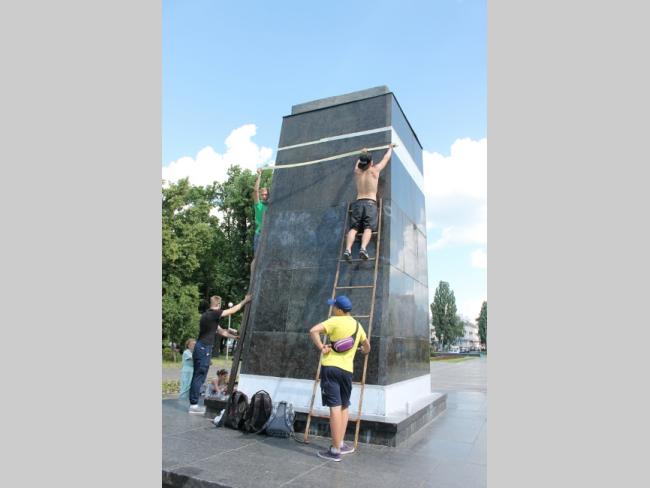 Сегодня на центральной городской аллее возле постамента, на котором еще недавно находился памятник Ленину, прохожие наблюдали как там кипит работа, как и завещал великий вождь. В то время, когда работницы коммунальных служб, в поте лица приводили в порядок клумбу, возле постамента, над постаментом, не менее напряженно, работали молодые люди.