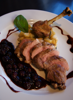 - Утиная грудинка с ежевичным соусом и яблочным соте 59 грн.(Франция и просто мега-хит);