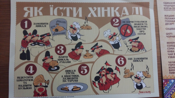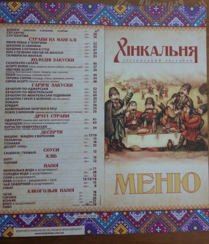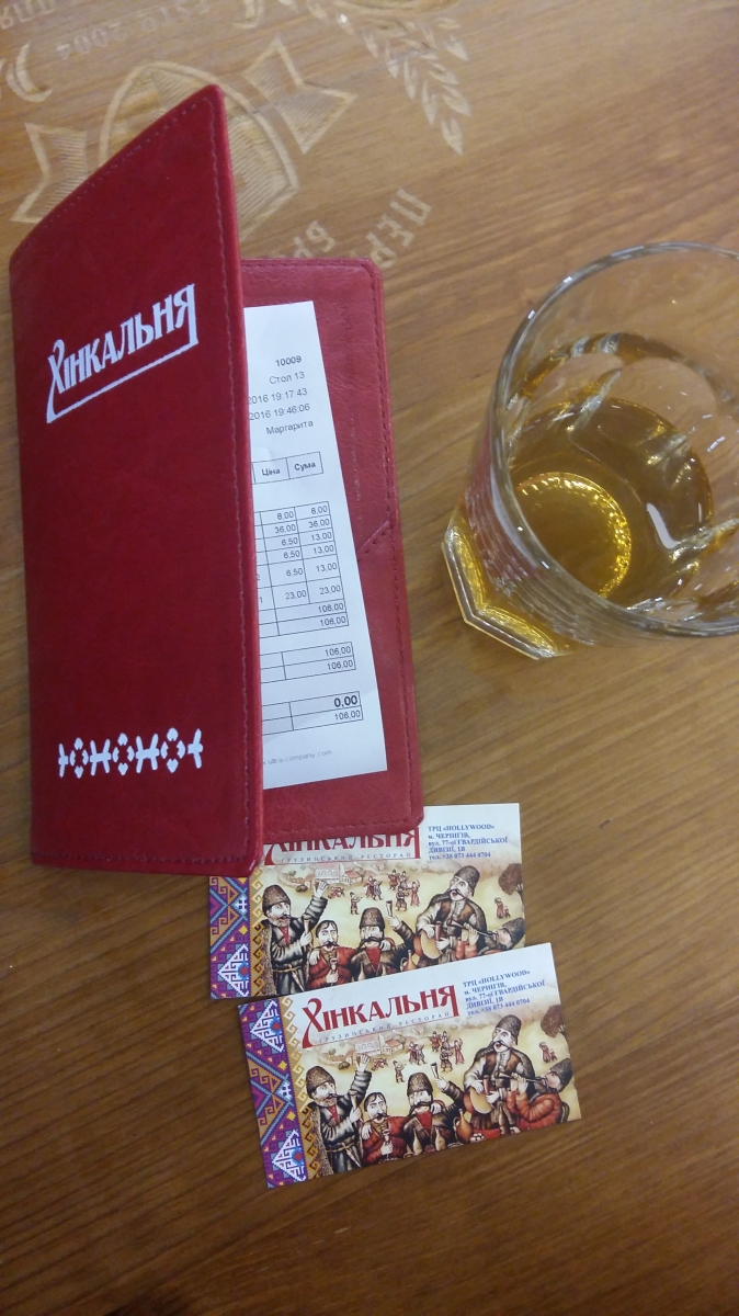На прощанье нам сказали приходить еще. Счет составил 106 гривен, его приносят в кожаной книжечке красного цвета, внутри две визитки Хинкальни.
