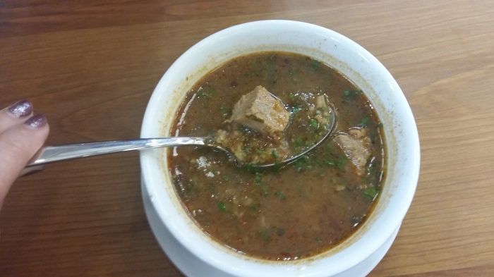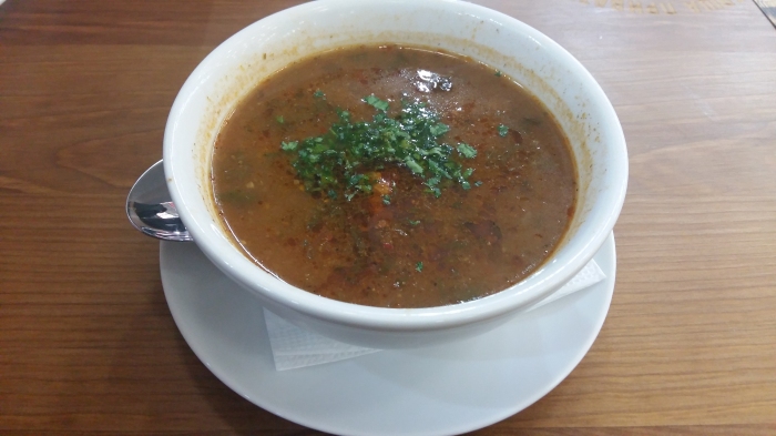 Маргарита, посоветовала нам взять пробный набор из 3 штук – классические, с зеленью и с сыром, одна штучка стоит 6.50 грн. Так как денег с собой было не особо много, а терминал у них еще не работал решили попробовать самые недорогие блюда и те, что звучали более-менее знакомо. Это хинкали, суп «Харчо» пиво и пеламуши с узваром. Официанты клиентам разъясняют, что подразумевают собой позиции в меню, так как часть названий звучит для тех, кто вообще не знаком с грузинской кухней весьма загадочно. Девушка сразу предупредила, что так как работают второй день – заказ придется ждать минут 20. Тем не менее, суп принесли через 10 минут, хинкали минут через 15. С пивом немного напутали, сперва принесли правильное (причем бокалы соответствуют марке пива, есть Отингер, Бочковое, Бархатное и еще какое-то, цена от 14 до 23 за 0.33-0.5, хотя в меню написано, что от 14 до 19 грн), затем Бочковое и снова Отингер.