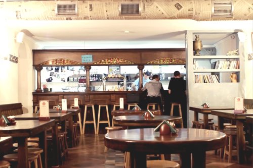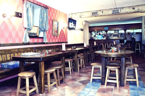 Нужно сказать, что в пабе много элементов интерьера выполнено архитекторами лично. Это и витражные узоры, и росписи на стенах в туалетах, которые стали шуткой архитекторов и веселым удивлением, как гостей, так и самих Заказчиков. Закрывая за собой дверь женского туалета – оказываешься в городской канализации с трубами, разведенными по всем стенам и сдвинутым канализационным люком на потолке. За дверью мужского сан. узла спрятана маленькая кухня с кухонной плиточкой на стенах, росписями – рецептами, полками с кастрюлями, горшками, половниками.