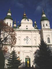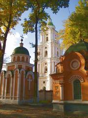 Построена она была в 1677-79 гг., как трапезная, на юге от Троицкого собора. Безстолбная, одноверфная, с граненой апсидой. Вертикали барочных бань над центральной частью и апсидой уравновешивает с запада удлиненный трапезный зал с вспомогательными службами. Насыщенный декор северного фасада, повернутого к собору, подчеркивает разное функциональное назначение помещений. Это единственная двукупольная церковь, которая сохранилась на Левобережье (форму верхов изменили вследствие восстановления после пожара 1808). По выразительности форм принадлежит к лучшим памяткам поры барокко на Украине.