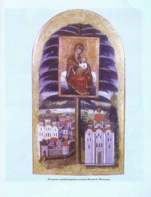 У цьому випадку маємо приклад зображення давньої чудотворної ікони після її явлення на дереві на тлі міського пейзажу Чернігова. Перед нами композиція, в якій дуже сильне фольклорне начало. В Україні аналогів такої композиції ми не віднайшли. У російському ж мистецтві другої половини ХVII ст. подібні твори були досить поширеними. Деякого розповсюдження вона набула і в Білорусі.