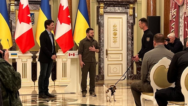 Пес Патрон отримує нагороду від Зеленського в присутності Трюдо