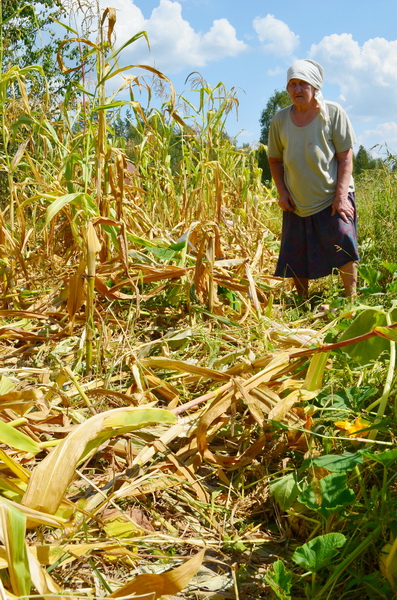 Ланкою кукурудзи наче комбайн пройшов: стебла перекушені, качани поїдені. Залишків врожаю майже не має. Де-не-де який кусень кукурудзяного качана полишений. Підбирає його господиня, охає: „Такий врожай загубили. Не один день з паличкою лазила по городу, убивалася, а вони в одну ніч стільки праці звели нанівець…” Зінаїда Антонівна розповідає, що в ніч на вівторок собаки по селу з одинадцятої ночі гавкали, не могли заспокоїтися аж до третьої ночі. Вийти 76-річна мешканка села, яка живе сама, побоялася. А вранці, коли побачила наслідки нічного бенкету диких тварин, сконструювала на яблуні нехитрий пристрій для відлякування лісових нахаб. Згодилися і металеві листки, і залізна миска. Побоюється Антонівна за капустяну грядку. Ліс, він ось – городець майже в нього вростає. А раптом свиням знову смаколиків захочеться? „Щось рано вони з`явилися, – аналізує Зінаїда Антонівна, – зазвичай наприкінці серпня бенкетують…”