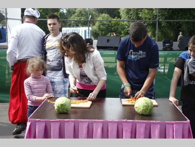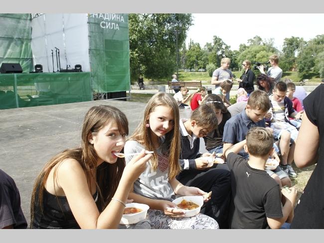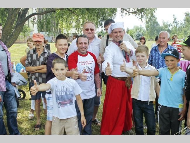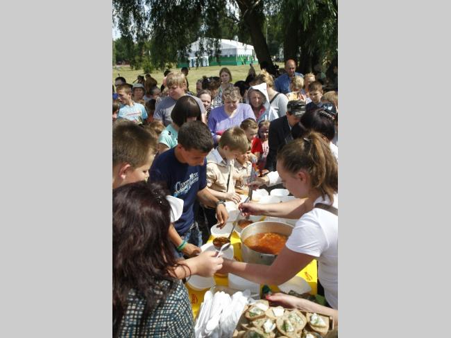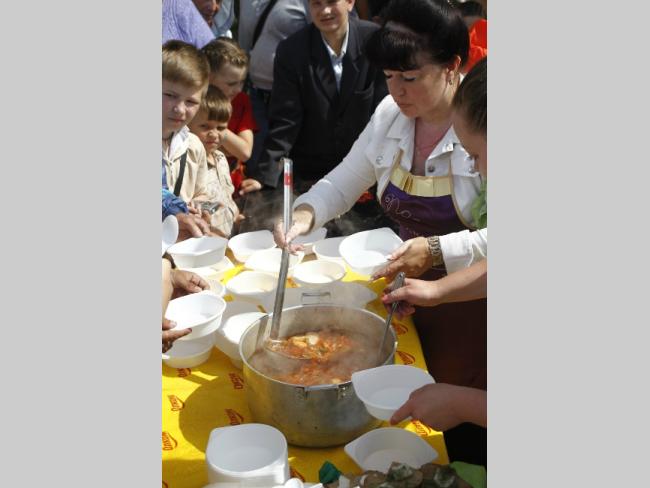 В благодарность за помощь в готовке ведущий подарил своему помощнику майку с надписью – «Вчерашний борщ будет завтра». Пока взрослые занимались нарезкой овощей и собственно кухней, малышню тоже развлекали. Было множество веселых и забавных конкурсов, танцы и, конечно же, сюрпризы для отличившихся. Кстати, для гостей варили два варианта борща – постный и с мясом. Без фирменной приправы – укропа не обошлось. Горожанам угощение оказалось по вкусу: