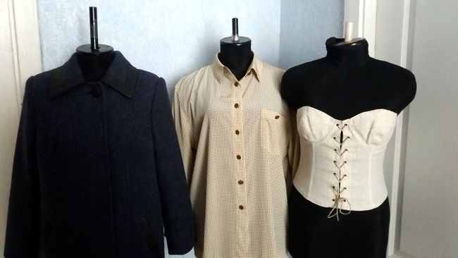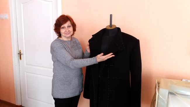 Светлана Трифоновна показывает работу одной из учениц: мужское полупальто в процессе пошива