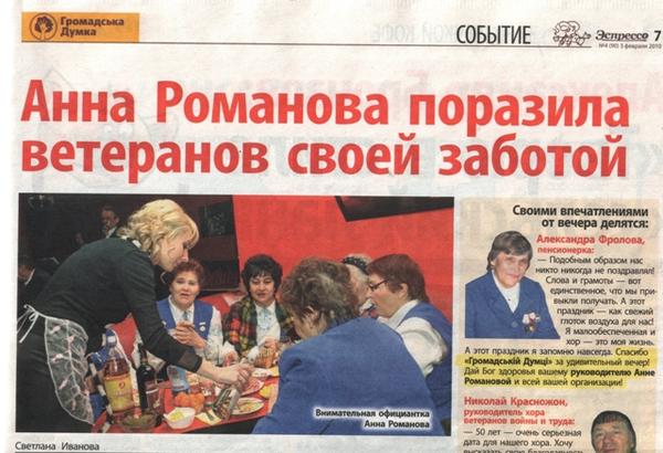 ..."ГД"...совместно с городскими властями устроила в честь юбилея праздничный вечер в ресторане "Монарх". А на вечеринке, несмотря на свой статус (невестка головы областной рады - авт.) и положение (наверное беременна - авт.), лидер Объдединения Анна Романова сама обслуживала ветеранов ( - авт.)!