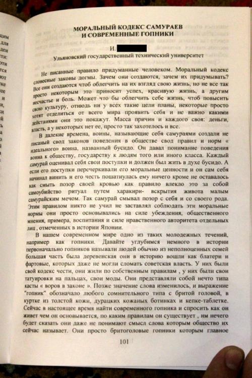 Фотографии - не шутка и не прикол. Это отрывки из научного (!) доклада некоего юного самородка, очарованного эстетикой ГОП-АРТа. Сия работа в числе прочих была представлена на Международной научной студенческой конференции "Студент и научно-технический прогресс", что проводится НГУ под патронажем СОРАН, совместно с СибАГСом (в советские годы - Всесоюзная конференция, ВСНК), если вам о чём-то говорят эти сокращения.