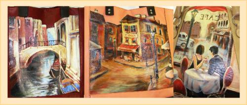 С подачи знакомого бизнесмена взялся за новое для меня дело - роспись по коже. Как видите, она вполне себе художественная, сюжеты - всё больше разнообразные виды Венеции, Лондона, Нью-Йорка, французской провинции, романтические парочки в кафешках и прочее в том же духе.